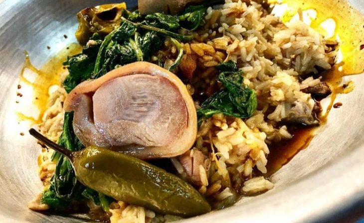 6. Quando as carnes de galo e porco estiverem bem cozidas e macias, finalize com salsinha e cebolinha. Sirva com arroz branco;
